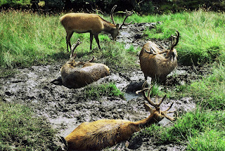 | Red Stags having a mud bath. |